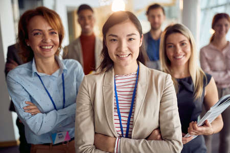 young asian businesswoman, standing in front of her team. arms crossed, smiling, looking at camera. eye contact