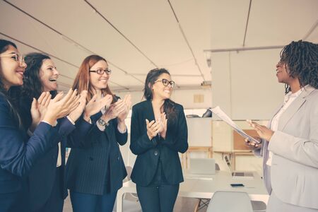 Side view of cheerful coworkers applauding after presentation. African American office employee talking while standing with paper documents. Business presentation concept