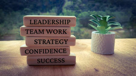 Text on wooden blocks - Leadership, Team work, Strategy, Confidence and Success. With plants and blurred nature background. Business concept.