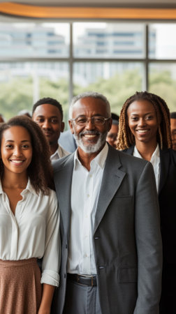 African American man leading a diverse group of business professionals in a modern office setting. Concept Corporate Leadership, Diversity in Business, Modern Office Environment