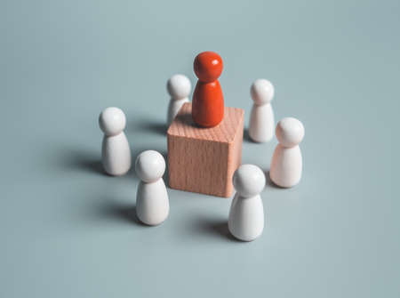 Wooden figure standing on the box for show influence and empowerment. Concept of business leadership for leader team, successful competition winner and Leader with influence
