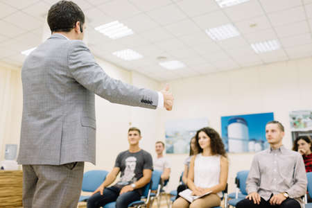 Male Professional Lecturer Speaking In front of the Group of People. Horizontal Image Composition. Horizontal Composition