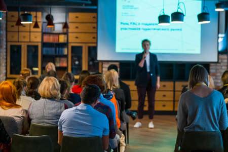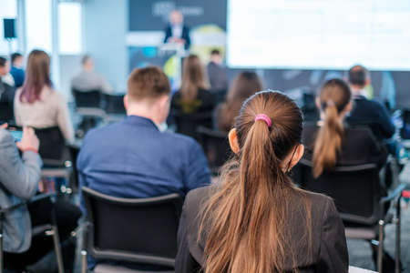 Conference participants, events, presentations, listen to the speaker sitting in chairs. Rear view of men and women during the event. Further education, education for businessmen and managers.