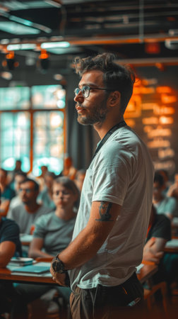 A focused young man in glasses attentively listens and ponders during a business conference, absorbing valuable insights and knowledge.
