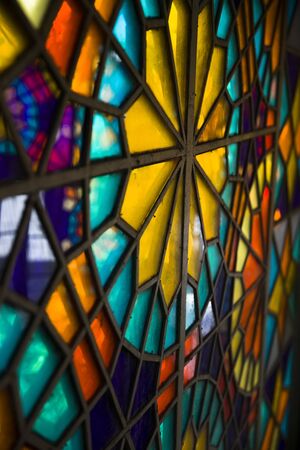 Colorful stained glass window in a church, close-up.