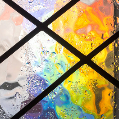 A view through a rain-streaked window pane transforms the outside world into a vibrant, abstract canvas.