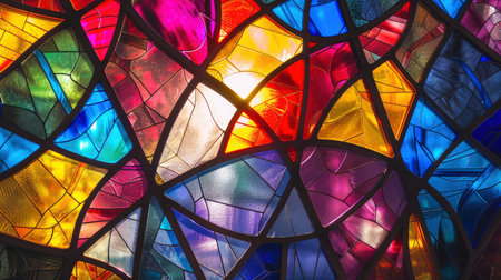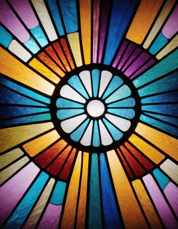 Stained glass geometric colorful symmetrical abstract sunlight window pattern circular decorative design with vibrant energy