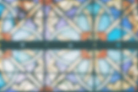 Blurred Image of a multicolored stained glass window. Stained glass in a cathedral with irregular block pattern