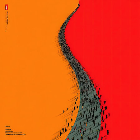 Single Red Figure Standing Out Among Colorful Crowd of Blue and Yellow Figures