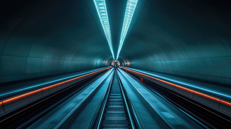 This image features a sleek, modern tunnel with illuminated walls and a dark exit, representing journeys and transitions in a minimalist environment.