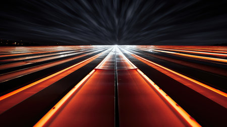 An illuminated geometric tunnel features a vibrant red carpet leading to an unknown point. The scene is defined by linear elements and a dark, contrasting background. The bright lights and bold colors create a modern, dynamic composition. Suitable for various design projects, this image conveys depth and visual interest.