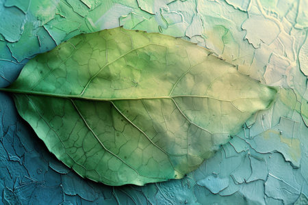 A detailed close-up of leaf veins, with an ethereal gradient from deep green to light blue and purple, set against a soft background that creates depth in the colors. The texture is intricate and delicate, resembling fine lace work, with subtle lighting effects highlighting its natural beauty. This artistic representation symbolizes growth, vitality, nature's tranquility, and the interconnectedness between plants and life forms. --ar 107:30 --stylize 750 --v 6.1 Job ID: a2347c0f-5912-4d7a-9a75-1794a9209ae2