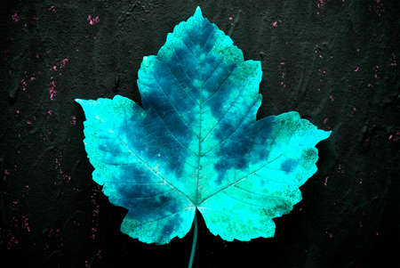 Macro photo of a dry autumn maple leaf with unique blue and red tones on a light blue background. Contrast, detailed texture, vibrant colors perfect for abstract nature, seasonal and design concepts.