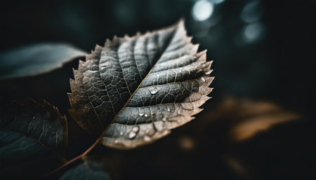 A stunning macro photograph of a golden autumn leaf, glistening with dew drops. Rich colors and intricate details.