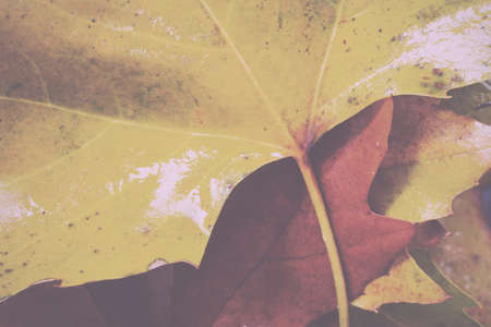 Close up of frozen autumn leaves with ice on them Vintage Retro Filter.