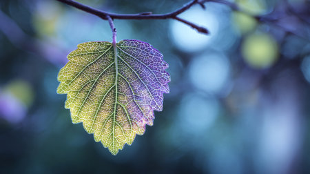 Dreamy aspen leaf transitioning from green to purple in an ethereal bokeh.