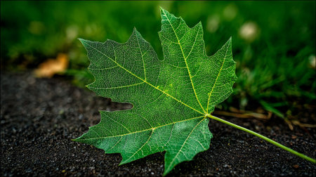 Vibrant Green Maple Leaf Resting on the Asphalt Pavement in Nature