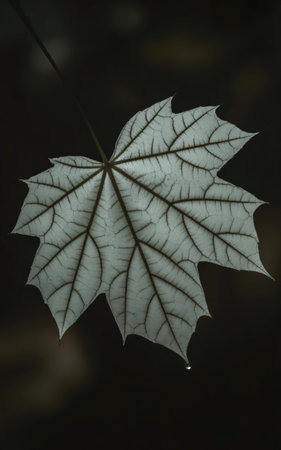 A close-up shot of a single maple leaf, showcasing its intricate vein structure and textured surface against a deep, dark, and blurred background.