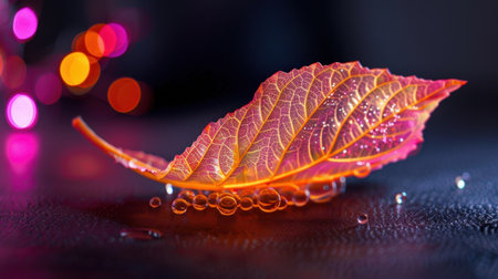 A stunning close-up of a vibrant leaf adorned with water droplets, set against a dark background with colorful bokeh lights, creating a serene atmosphere.
