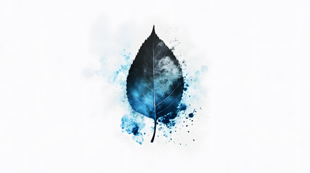 Stylized black leaf silhouette emerging from a splash of blue paint, creating a striking contrast against a white background