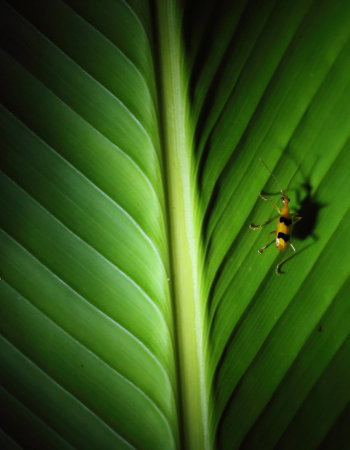 A small black and yellow stripped insect resting on a large leaf at night, generating a large shadow. Manuel Antonio National Park, Costa Rica.