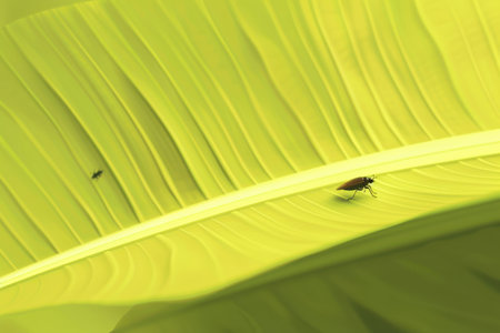 A captivating close-up image of a beetle perched on a vibrant green leaf, illuminated by soft sunlight during sunset, creating a serene nature scene ideal for various projects.
