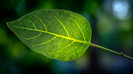 Translucent green leaf with intricate veins shining in the sunlight, nature's beauty.