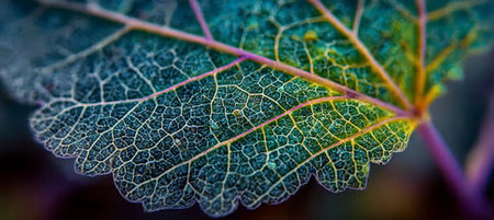 Translucent Leaf with Intricate Veins Against Abstract Green and Blue Background