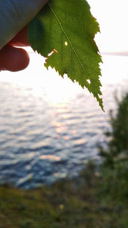 Close up woman showing green leaf covered with epoxide resin concept photo. First view person photography with blurry background. High quality picture for wallpaper, travel blog, magazine, article