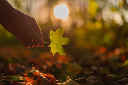 Yellow leaf in woman hand in sunny rays. Autumn mood.