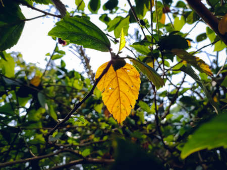 A small lighted yellow leaf close-up macro shot in the day time in india.