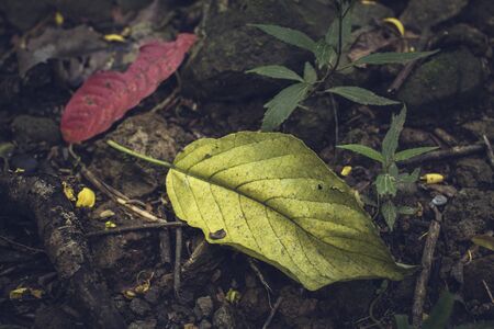 Autumn leaf on the ground in the beach with morning light at sunrise.