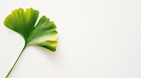 Aesthetic green ginkgo biloba leaf, copy space, white background, presentation template. Generative AI.