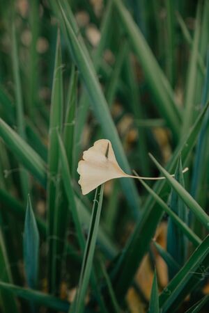 leaf of a yucca plant pierced a beautiful yellow leaf of a relict ginko tree of an unusual shape. Close-up