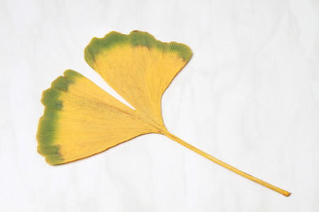 Macrophotography of Yellow ginkgo leaf on white background.