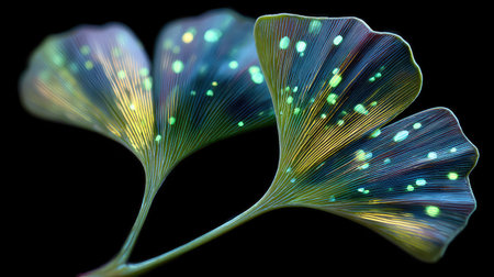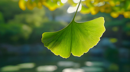The image captures a close-up of ginkgo biloba leaves, showcasing their fan-like shape and vibrant green hues. The composition highlights the delicate texture of the leaves with soft lighting. This image conveys a sense of nature and organic elements, suitable for various editorial and commercial applications. The background is blurred, focusing attention on the leaves.