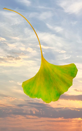 Colorful ginkgo biloba leaf on the background of sunrise sky for design
