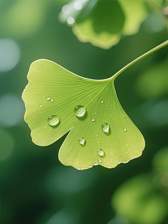 Ginkgo biloba leaf with dew drops on green background
