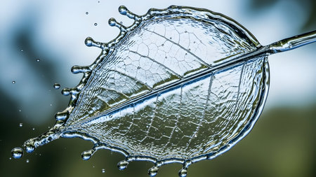 Macro shot of skeleton leaf. Splashing water droplets. Intricate patterns. Artistic liquid formation. Clear environmental concept.