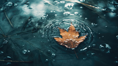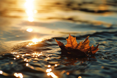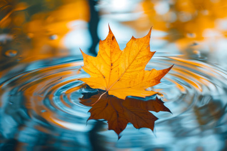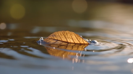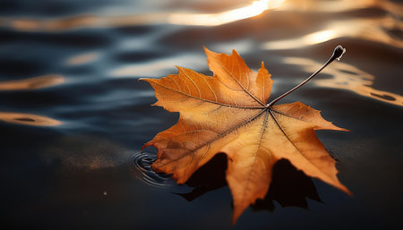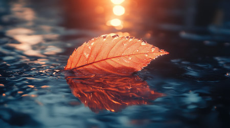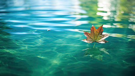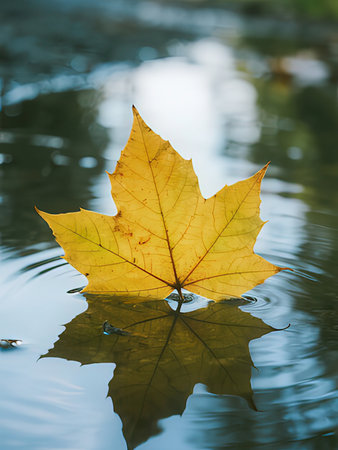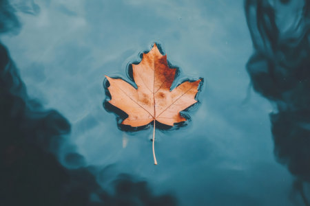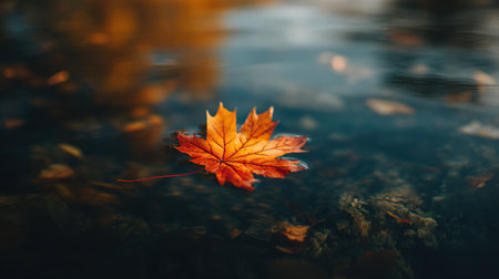 An autumn leaf floats peacefully on a calm water surface, reflecting the surrounding environment. The image showcases the leaf's vibrant colors and textures against the water's cool tones. Soft lighting and a shallow depth of field create a sense of tranquility, ideal for various editorial and commercial applications.