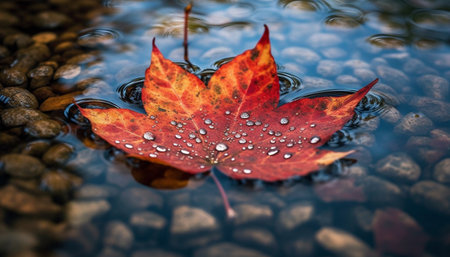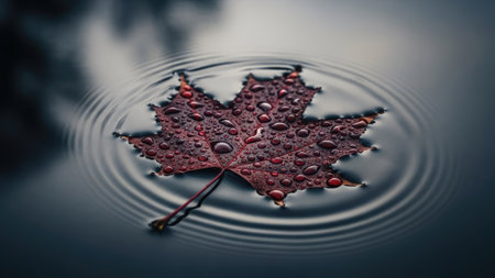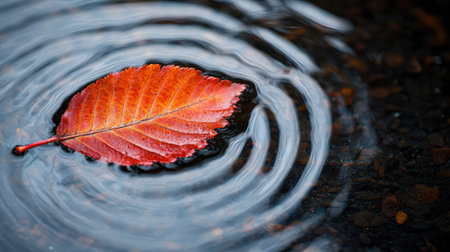 A single red leaf, covered in water droplets, floats gently on a dark, reflective surface. Circular ripples emanate from the leaf, creating a dynamic visual effect. The image features a shallow depth of field, with soft focus and natural lighting. This image could be suitable for various editorial or commercial applications.