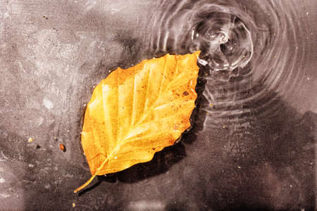 Autumn leaf falling into water with ripples and ripples.