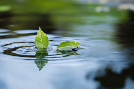 Two green leaves rest gently on the surface of a tranquil pond creating ripples in the clear water under soft natural lighting.