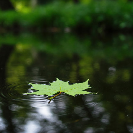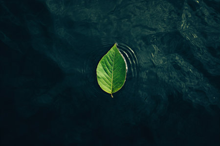 A single vibrant green leaf gently floats on a dark, calm water surface, creating subtle ripples around its edges, highlighting tranquility and natures simplicity.