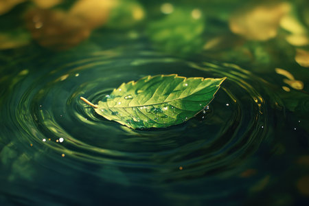 A vibrant green leaf gently floats on the surface of calm water, creating delicate ripples that enhance the serene and peaceful atmosphere of this nature scene.
