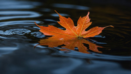 Vibrant orange maple leaf gently floating on the surface of calm dark water, creating subtle ripples