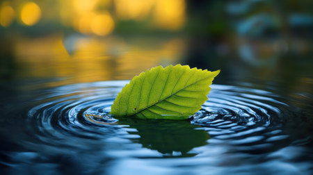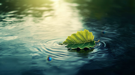 A vibrant green leaf gently floats on the surface of calm water, creating ripples under soft sunlight. This serene image evokes a sense of tranquility and connection to nature.