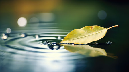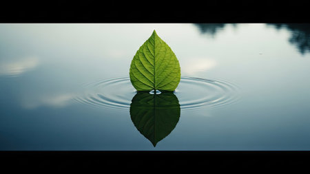A serene close-up view of a single green leaf floating on calm water, creating gentle ripples. The peaceful scene captures nature's beauty and tranquility, ideal for wellness and relaxation themes.