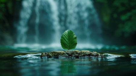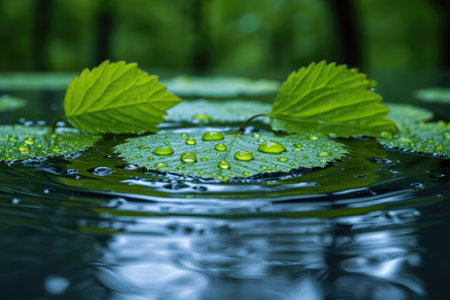 A tranquil green leaf rests gently on the calm surface of water, creating ripples that enhance the serene atmosphere. Ideal for nature-themed projects.