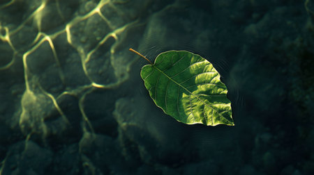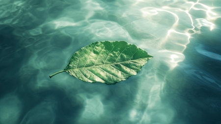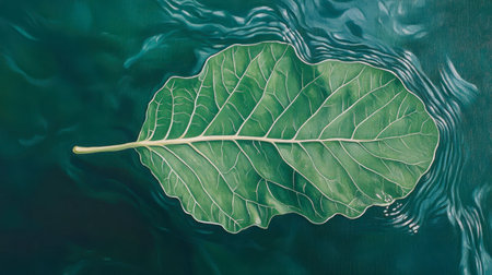 A vibrant green leaf floats serenely on calm water, surrounded by gentle ripples. The intricate detail of the leaf highlights the beauty of nature and tranquility.